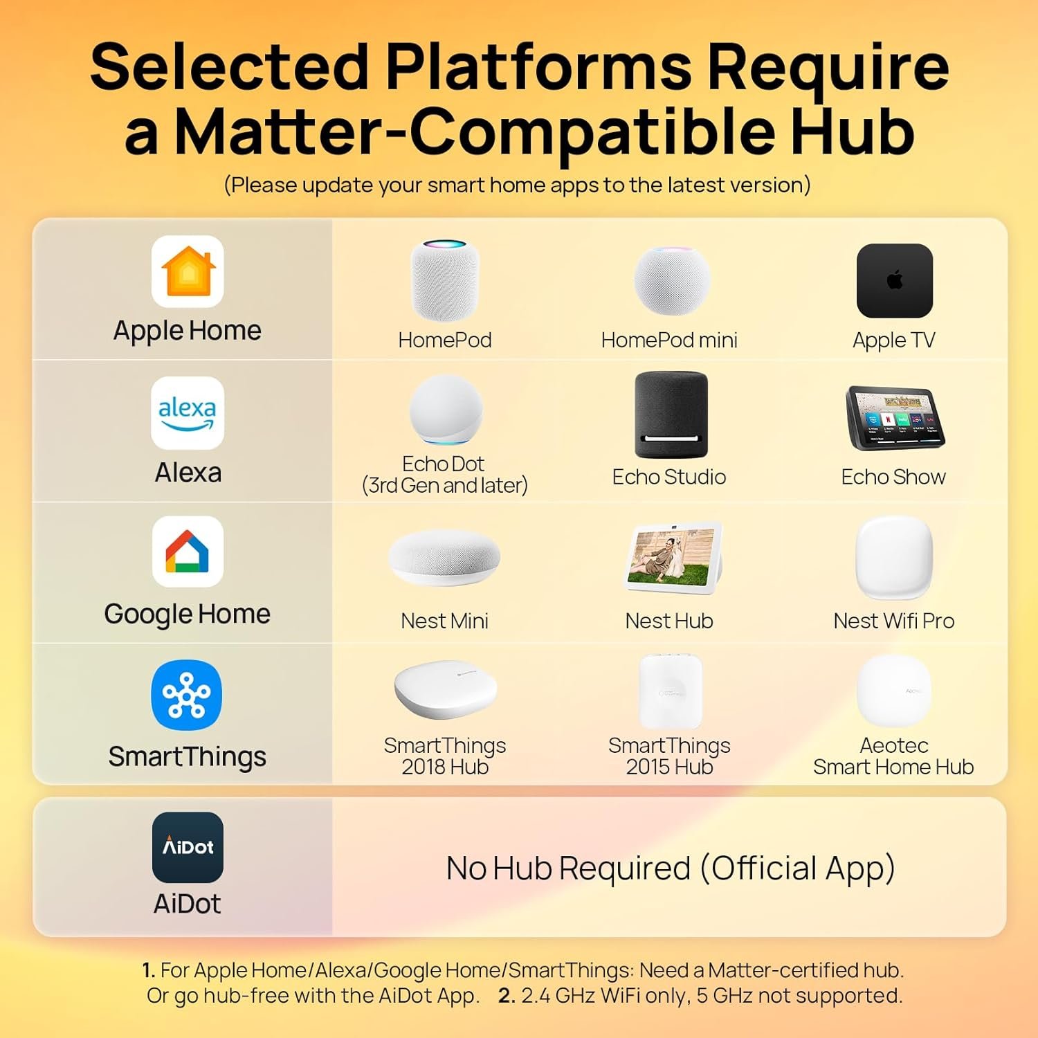 • 【Easy Setup, One Control】With Matter, Skip the step of downloading and registering multiple manufacturers’ apps every time you buy a new device. Instead, head straight to certified smart home platforms like Apple Home, Alexa, Google Home, SmartThings, or AiDot to control all your Matter devices.【TIP】Matter-certified hub or controller (HomePod, Echo Dot, Nest, SmartThings Hub) is required for Apple Home/Alexa/Google Home/SmartThings platforms. Alternatively, the AiDot app can be used without hub