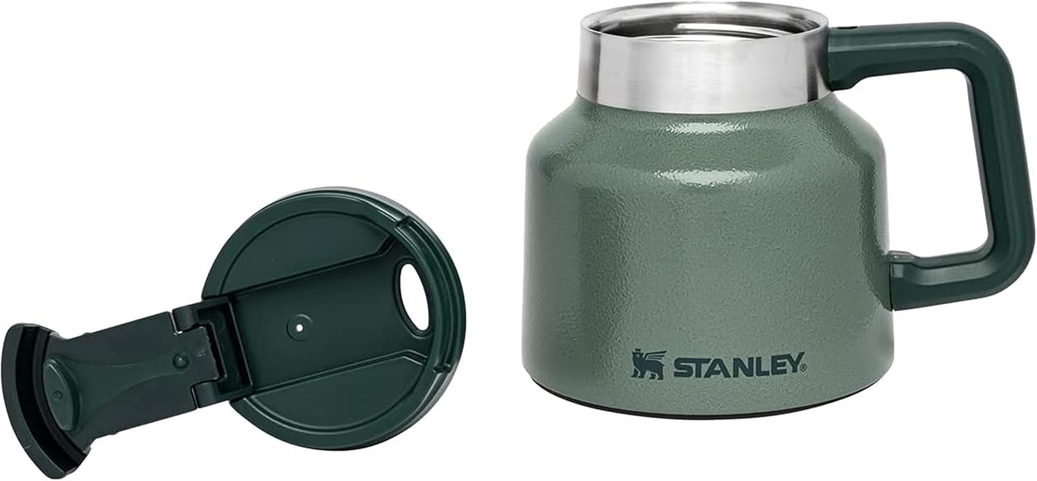 Mug 20 oz – STANLEY’s Tough-To-Tip Admiral’s Mug is a 20 oz insulated stainless steel coffee cup designed for people who need their drinks to stay hot, cold, or iced for long stretches—whether that’s on a boat, on the road, or at a desk. Its standout features include a wide non-skid rubber base that resists tipping, a twist-on flip lid, and materials that are both BPA-free and dishwasher safe. The mug promises reliable temperature retention with double vacuum insulation, making it versatile for coffee, water, or iced beverages throughout the day.