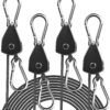 - Heavy Duty Yet Flexible: Each rope hanger uses a durable polypropylene rope that’s tear-resistant and paired with metal gear ratchets, supporting up to 75 lbs per unit (300 lbs per 4-pack). This makes it perfect as both a heavy duty tie-down for secure loads and a gentle anchor for fragile lamp fixtures.