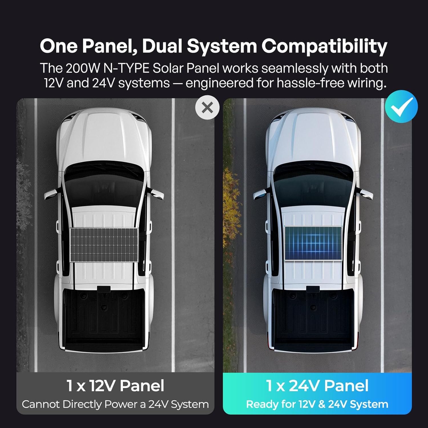 A: Its compact solar panel design is 7.5% smaller and 11.7% lighter than other 200 watt options, making it well-suited for tight van roof solar applications. The high efficiency (25%) ensures you get maximum power in minimum space.