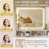 - Large HD Mirror with LED Lighting: Featuring a large HD mirror with lights and 3 customizable color modes (warm yellow, warm white, cool white) that deliver adjustable brightness via a modern touchscreen interface. Perfect for flawless application in any lighting environment.