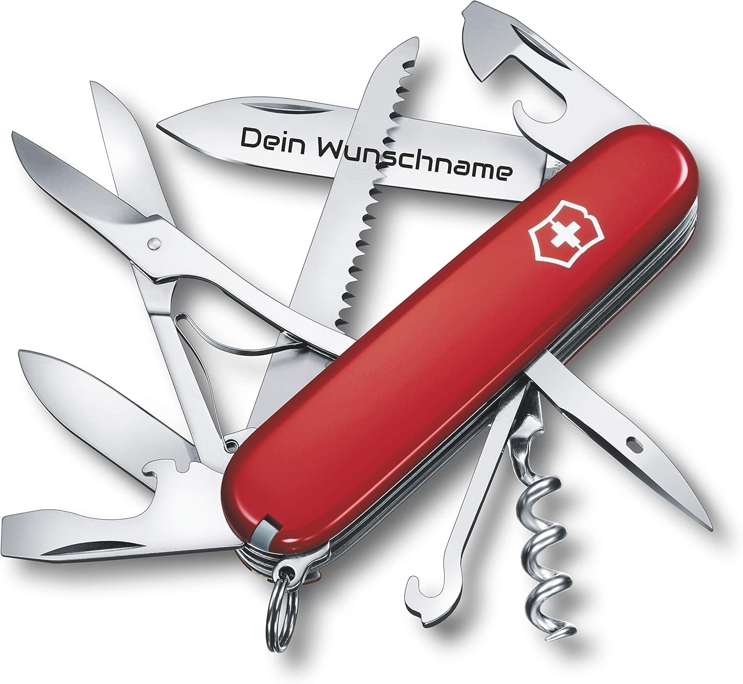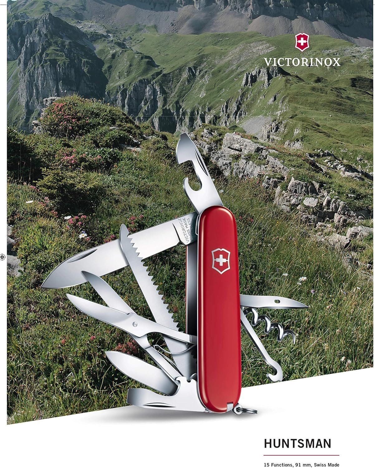 - HUNTSMAN: Head off the beaten track and into the unknown with the Swiss made pocket knife Victorinox Huntsman by your side. Key features include a wood saw, scissors and multipurpose hook.